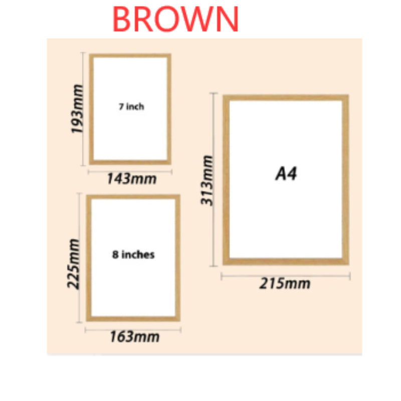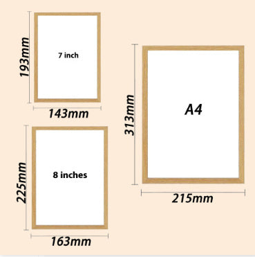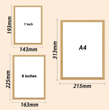 Specifications: 7-inch frame - tri color light switch, 8-inch frame - tri color light switch, A4 frame - tri color light switch